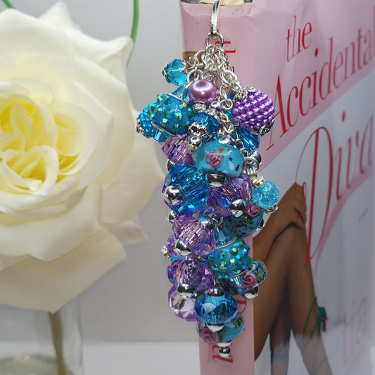 This beaded bookmark is an original handcrafted piece. It's designed with different sizes of purple and turquoise glass beads on a silver bookmark hook. Each bead was carefully hand-wired and placed on individual split rings to create the desired look.